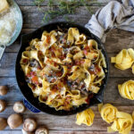 A traditional Italian pasta with a rich tomato sauce and the addition guanciale or pancetta. Bacon could be a substitute, just don't tell the Italians 😉