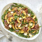 - Prepare the pan for the lamb. Spread a large piece of greaseproof paper on the base of the pan, leaving enough to protrude from both sides (we will use the greaseproof paper that protrudes to “close” the lamb). Place all the onions in the base of the pan. Spread them over the entire surface of the pan and salt them. Add the garlic and pour over the olive oil and stock. Salt the thigh on all sides and place it on top of the onions. With a sharp knife, score the thigh in 3-4 points diagonally. The grooves should be about 1-2 centimeters deep.