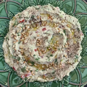 - Spread the “Melitzanosalata” on a plate. Drizzle with some olive oil and sprinkle with the sesame seeds, extra cumin seeds and the pine nuts. Break the pita toasts and dive in. It’s delicious.